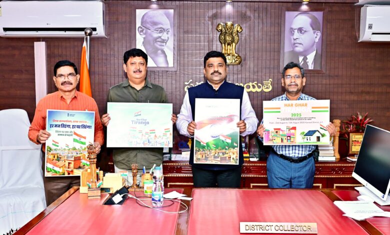 గురువారం తన క్యాంప్ కార్యాలయంలో హర్ ఘర్ తిరంగా కార్యక్రమాల ప్రచార పోస్టర్ ను జిల్లా కలెక్టర్ ఆవిష్కరించారు. ఈ సందర్భంగా జిల్లా కలెక్టర్ మాట్లాడుతూ కేంద్ర రాష్ట్ర ప్రభుత్వాల ఆదేశాల మేరకు ‘హర్ ఘర్ తిరంగా’ (ప్రతి ఇంటి ఫై మువ్వన్నెల జండా) కార్యక్రమాలను జిల్లాలో నిర్వహించడం జరుగుతోందన్నారు. భారత దేశ సంస్కృతి సంప్రదాయాలు ప్రతిబించే విధంగా ఆగష్టు 15 వ తేదీ వరకు గ్రామ పంచాయతీ స్థాయి నుంచి దేశ రాజధాని వరకు నిర్వహిస్తున్నారని ఈ కార్యక్రమాలను నిర్వహిస్తున్నారని తెలిపారు. ప్రతి భారతీయుడు తమ ఇళ్లలోకి జాతీయ జెండాను తీసుకువచ్చి గర్వంగా ఎగురవేసి వారి లో దేశ భక్తి పెంపొందించడం ఈ కార్యక్రమ ముఖ్య ఉద్దేశం అని కలెక్టర్ తెలిపారు. అన్ని ప్రభుత్వ, ప్రైవేట్ విద్యాలయాలలో హర్ ఘర్ తిరంగా కార్యక్రమం లో భాగంగా తిరంగా ప్రదర్శనలు, రంగోలి పోటీలు, తిరంగా రాఖి తయారీ, వర్కుషాప్స్ తదితర కార్యక్రమాలు నిర్వహించాలని కలెక్టర్ విద్యాశాఖ అధికారులను ఆదేశించారు.