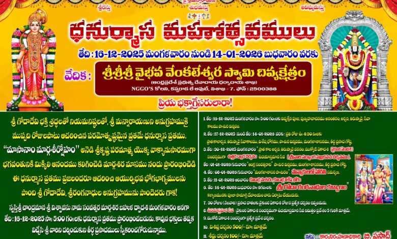 కప్పరాడ, ఎన్ జి జి ఓ ఎస్ కాలనీ విశాఖపట్నం లోని శ్రీ శ్రీ శ్రీ వైభవ వేంకటేశ్వర స్వామి వారి దివ్యక్షేత్రంలో ధనుర్మాస మహోత్సవాలు డిసెంబర్ 16 నుంచి జనవరి 14 వరకు భక్తిశ్రద్ధలతో నిర్వహించనున్నట్లు ఆలయ ఎగ్జిక్యూటివ్ ఆఫీసర్ బండారు ప్రసాద్ తెలిపారు. ఈ ఉత్సవాలు డిసెంబర్ 16 సాయంత్రం 5 గంటలకు ధ్వజారోహణతో ప్రారంభమై, జనవరి 14 భోగి పండుగ రోజున ముగుస్తాయని ఆయన వెల్లడించారు.